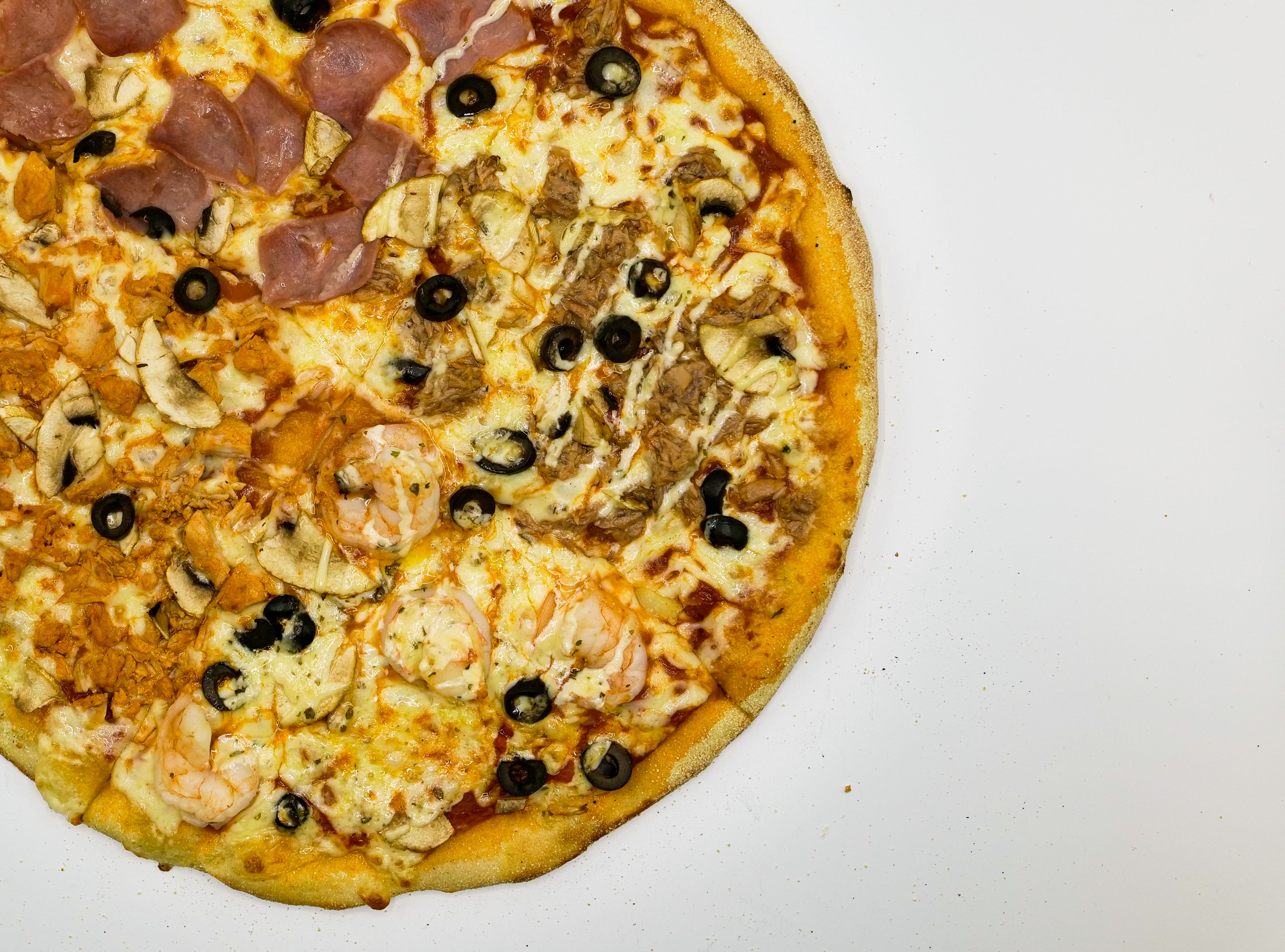 Sauce Tomate, Mozzarella, Champignons, Thon, Poulet, Scampis,Jambon de dinde, Olives noire