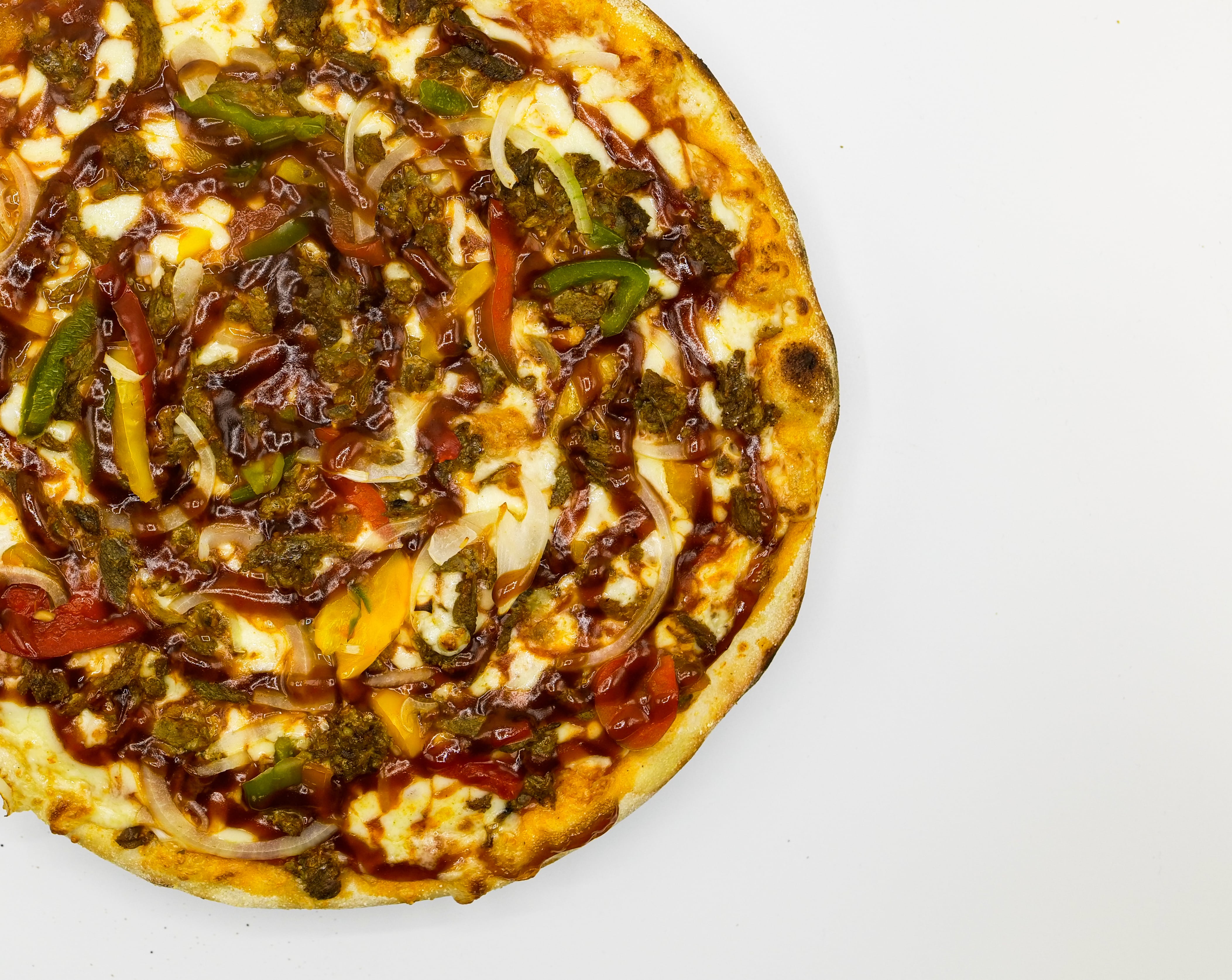 Sauce Tomate, Mozzarella, Viande Pitta, Poivrons, Oignons, Sauce barbecue