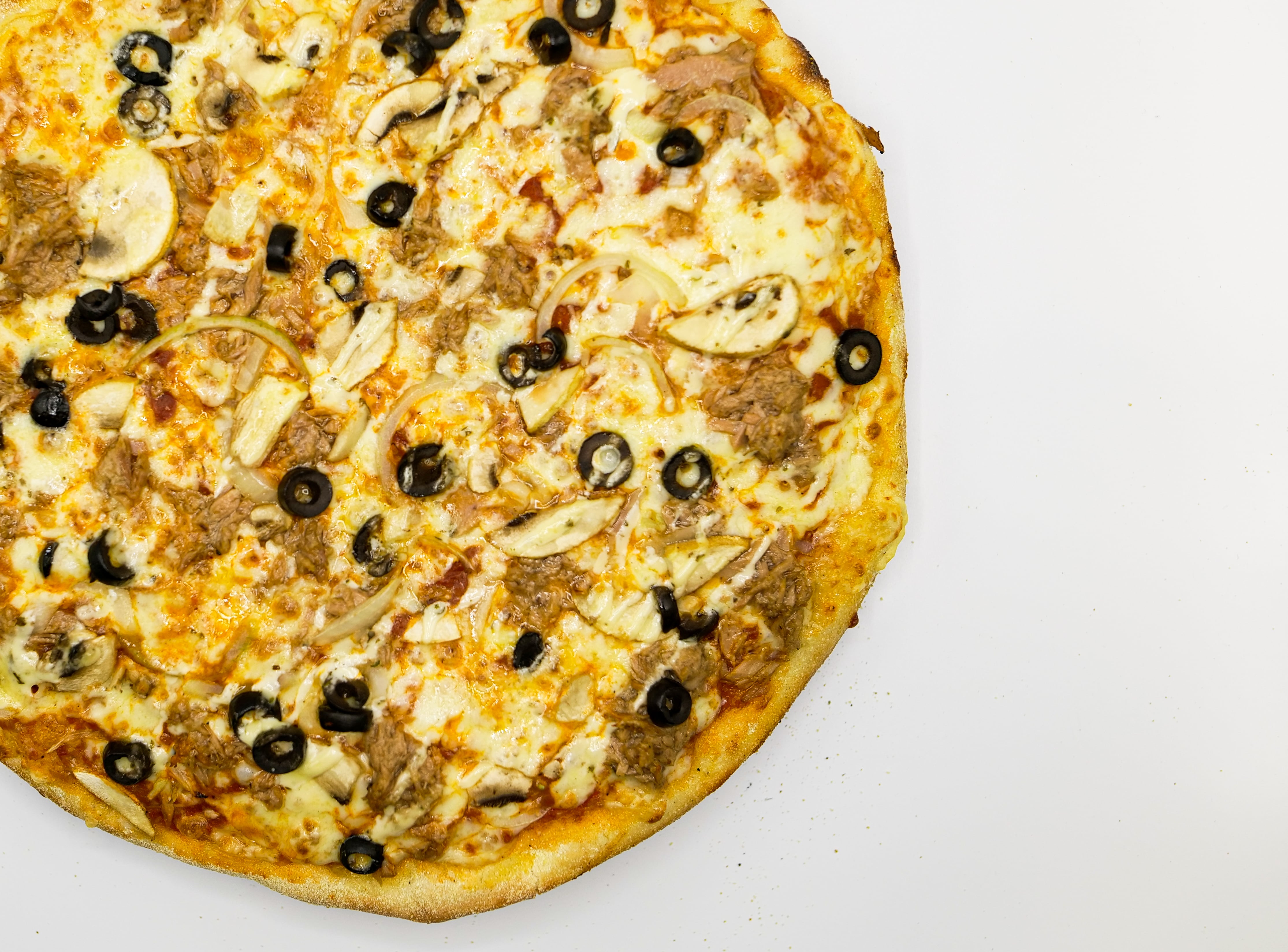 Sauce tomate, Mozzarella, Thon, Oignons, Olives noire, Champignons, Sauce à l'ail