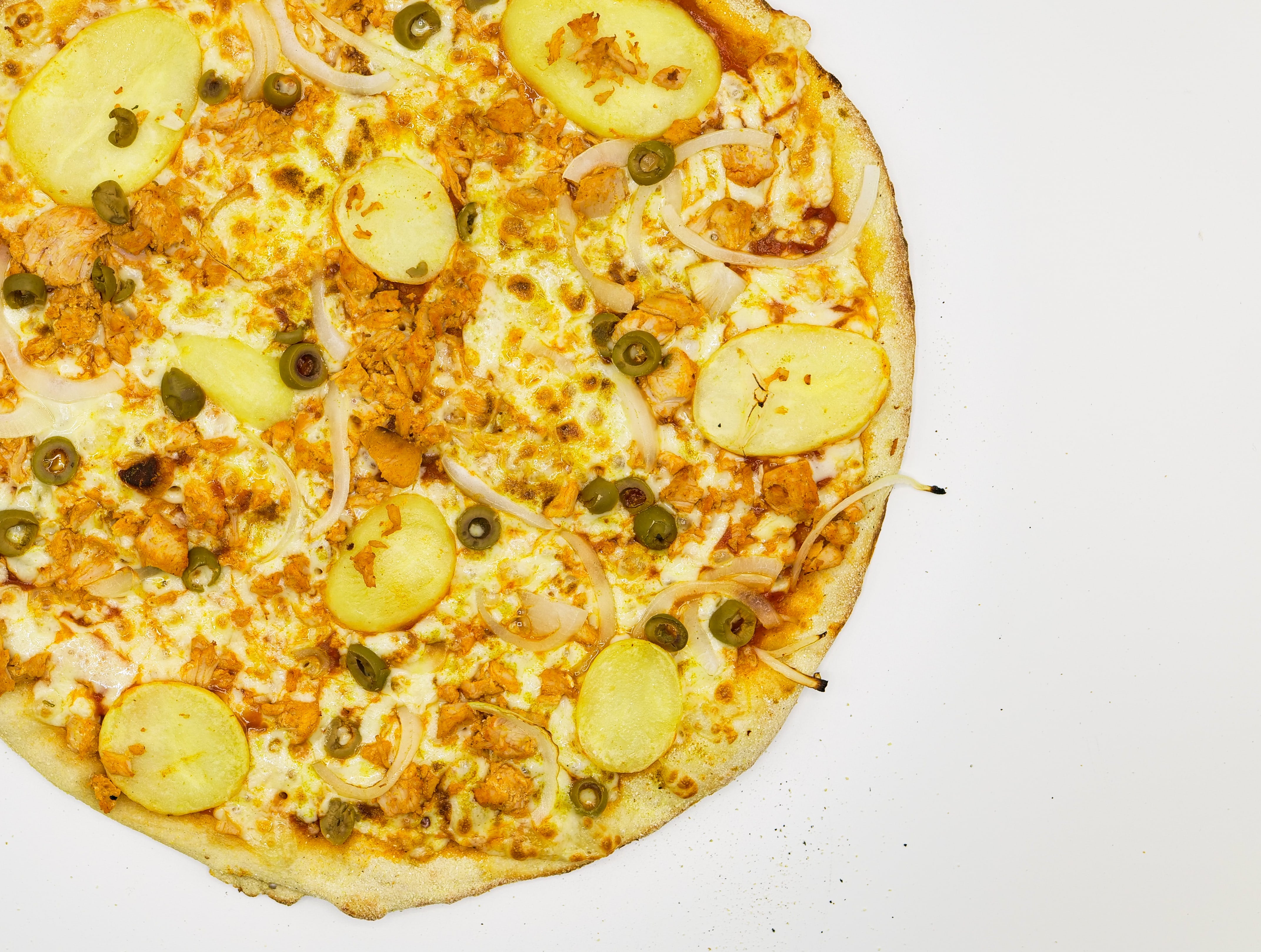 Sauce Tomate, Mozzarella, Poulet, Pomme de terre, Olive verte, Oignons, Ras el Hannout